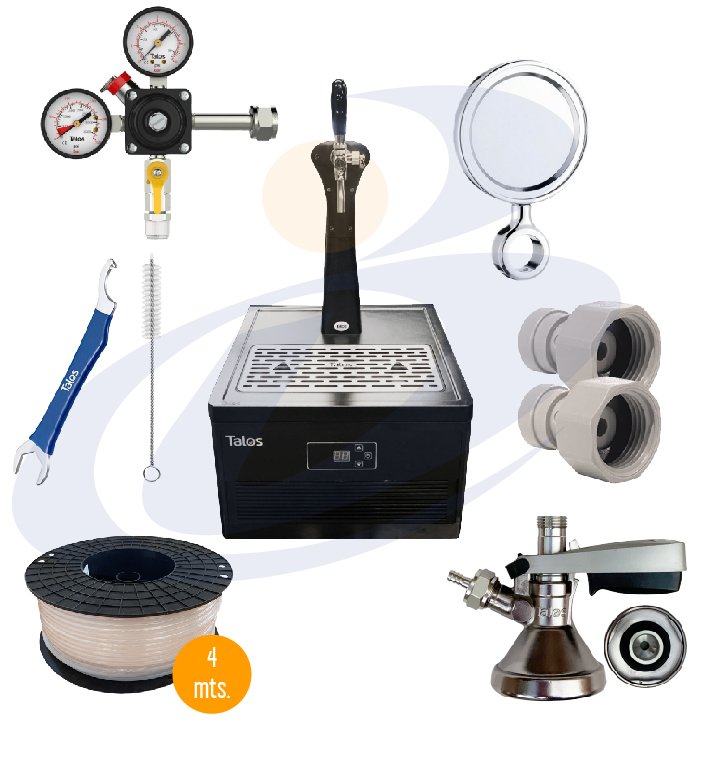 1 EQUIPO ENFRIADOR SOBREMESA 1 SALIDA MARCA TALOS, COBRA PLASTICA 1 SALIDA CON GRIFO Y MEDALLON DE ACERO, 1 PINCHADOR, 4 MTS DE MANGUERA, 1 MANOMETRO UNA SALIDA CON CONECTOR RAPIDO, 2 CONECTORES RAPIDO PINCHADOR, 585.000 MAS IVA